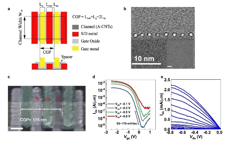 A片 、碳基电子学研究中心、纳米器件物理与化学教育部重点实验室张志勇-彭练矛联合课题组首次展示了基于阵列碳纳米管的90 nm节点晶体管和电路,探索了将碳基晶体管进一步缩减到10 nm节点的可能性。课题组利用前期发展的晶圆级高密度和高半导体纯度(~ 300 CNT/μ,99.9999%,Science 368, 850, 2020)碳纳米管阵列薄膜,同时缩减晶体管栅长和源漏接触长度(接触长度Lcon= 80 nm,栅长Lg= 85 nm),制备出CGP为175 nm的碳纳米管场效应晶体管,开态电流达到2.24 mA/μm,峰值跨导gm为1.64 mS/μm,性能超过硅基商用45 nm节点器件(图1)。