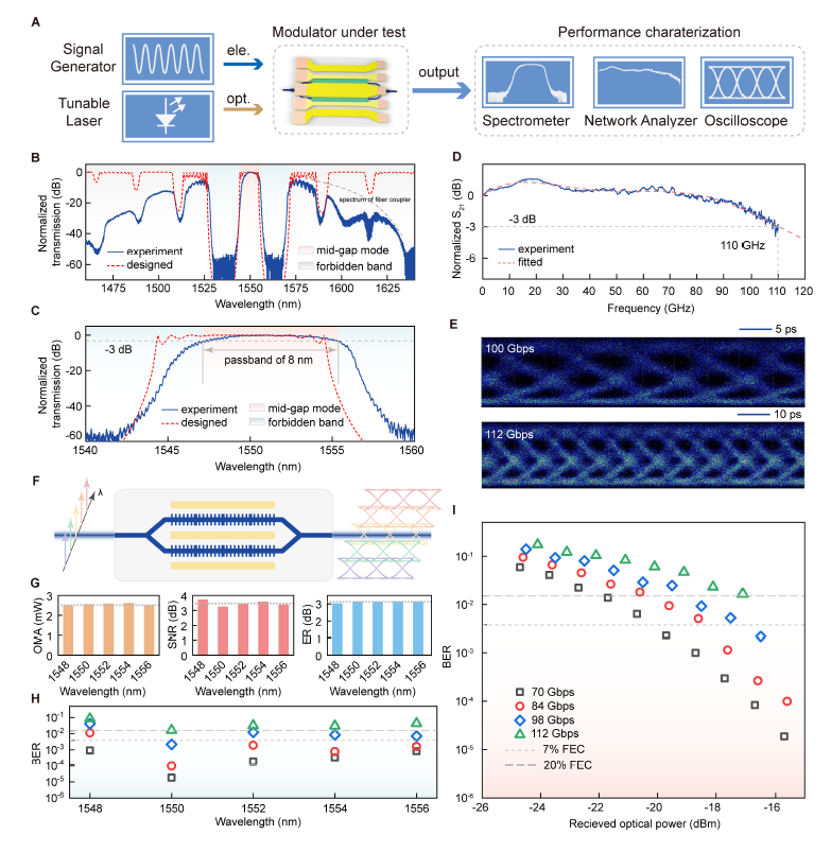 在该工作中,研究团队针对传统硅基调制器带宽受限的问题,利用硅基耦合谐振腔光波导结构引入慢光效应,构建了完整的硅基慢光调制器理论模型,通过合理调控结构参数去综合平衡光学与电学指标因素,实现对调制器性能的深度优化。研究团队基于CMOS兼容的硅基光电子标准工艺,在纯硅材料体系下设计并制备了在1550 nm左右通信波长下工作的超高带宽硅基慢光调制器,实现了110 GHz的超高电光带宽,打破了迄今为止纯硅调制器的带宽上限,并同时将调制臂尺寸缩短至百微米数量级,在无需DSP的情况下以简单的OOK调制格式实现了单通道超越110 Gbps的高速信号传输,降低了算法成本与信号延迟,同时在宽达8 nm的超大光学通带内保持多波长通信性能的高度均一性。研究团队在不引入异质材料与复杂工艺的前提下实现了硅基调制器带宽性能的飞跃,可实现低成本的晶圆级量产,展示了硅基光电子学在下一代超高速应用领域的巨大价值。