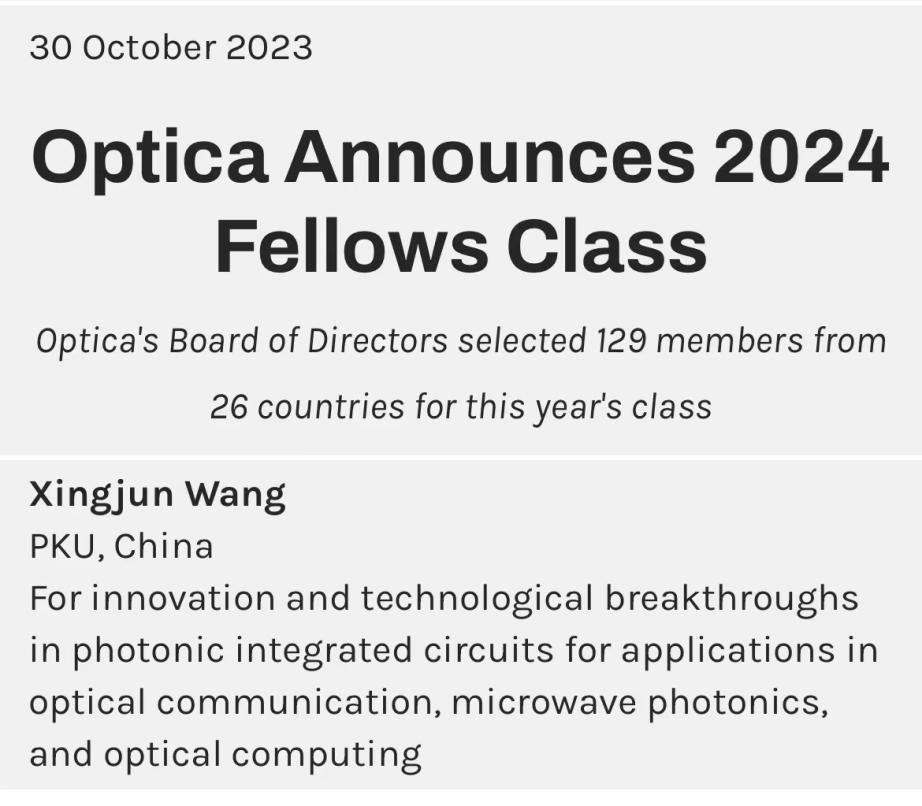 王兴军教授因其在面向光通信、微波光子和光计算系统应用的光子集成芯片研究领域开创性的贡献(For innovation and technological breakthroughs in photonic integrated circuits for applications in optical communication, microwave photonics, and optical computing)当选2024年度美国光学学会会士。