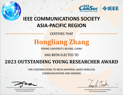张泓亮助理教授在马来西亚吉隆坡召开的2023年IEEE通信学会旗舰会议GLOBECOM上获得IEEE通信学会亚太地区杰出青年学者奖(IEEE Comsoc Asia-Pacific Outstanding Young Researcher Award),旨在表彰其在超材料辅助无线通信与感知领域的突出贡献。