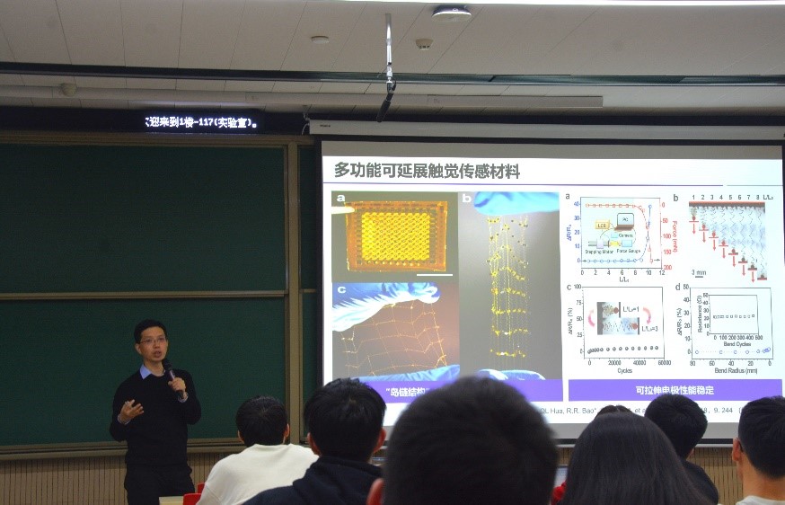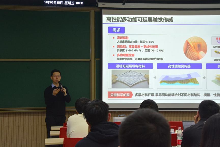 新燕园校区教学楼117成功举办。本次讲座邀请了北京航空航天大学原子制造研究院潘曹峰教授,为师生进行了主题为“低维半导体材料器件与触觉仿生”的精彩报告。本次讲座由A片