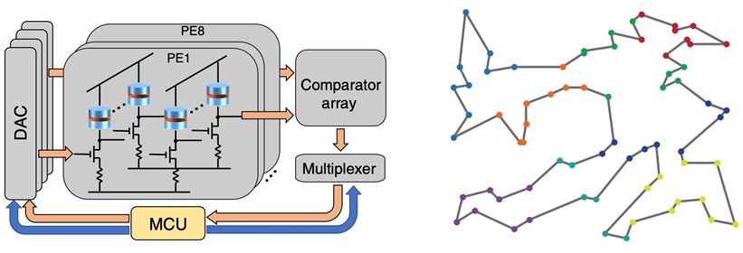 实验将80个超顺磁性隧道结集成在一个PCB板上,通过外围电路控制,实现了一个功能全面的80个节点的伊辛计算机,并通过算法设计,成功求解了70个城市的旅行商问题(此问题通常需要4761个节点),如图2所示。与现有伊辛计算机相比,本工作具有最高的能量效率。