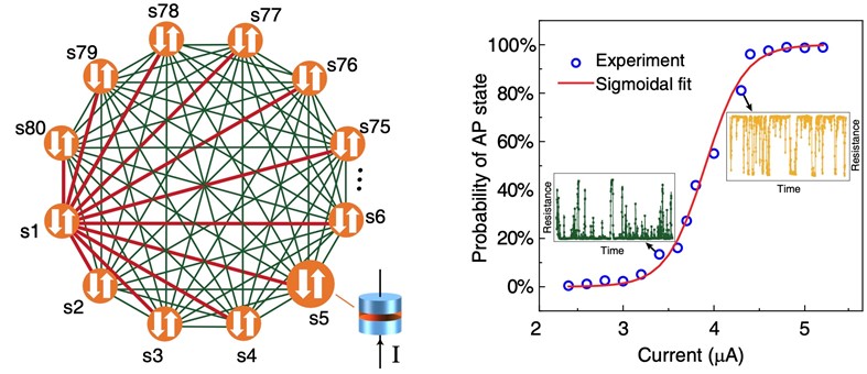 图1.基于超顺磁性隧道结的全联通伊辛模型及器件概率曲线