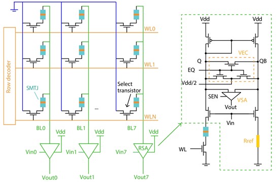 研究者进而提出了与MRAM技术兼容的cross-bar系统架构,如图3所示,通过仿真验证了4Kb节点的计算功能,展示了此方案未来大规模集成的可能性。