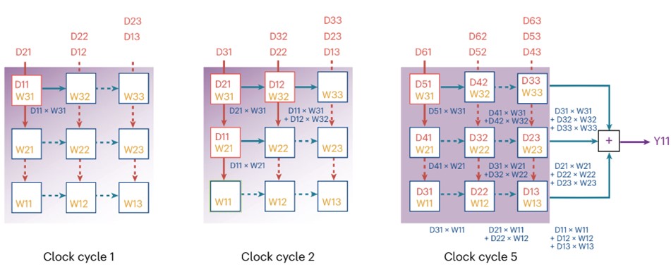 通过脉动阵列架构设计,芯片可实现高效地数据复用(如图3),大大节约了张量运算所需的数据存储、搬运等操作,精准匹配了神经网络的运算特点。