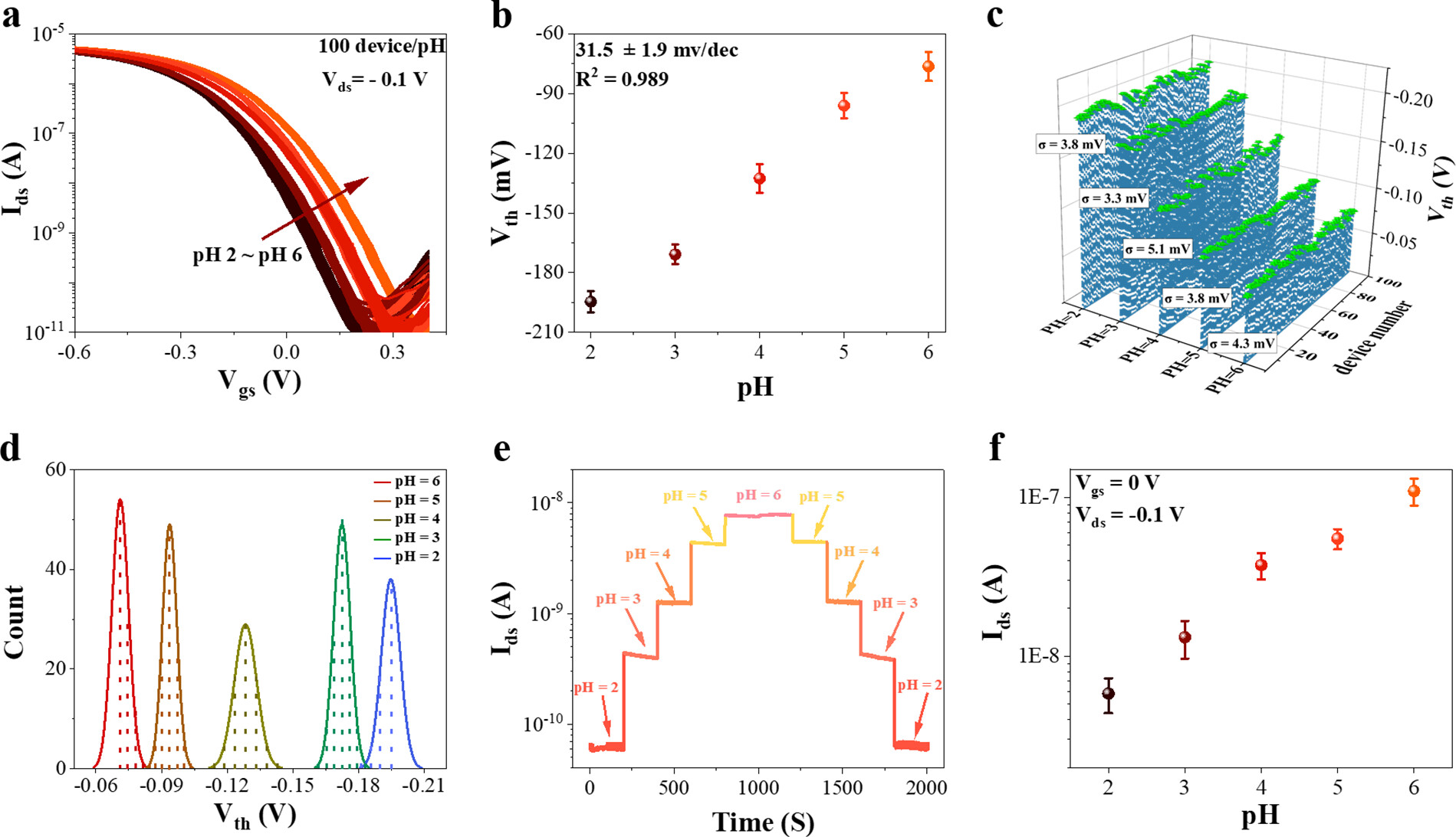 课题组进一步验证了基于CNT FET的离子传感器的可重复性,在每个固定的离子浓度下,所测试的传感器(100个)阈值电压的标准偏差在5.1 mV以内,这意味能够通过直接测试传感器的漏极电流来读取待测溶液的离子浓度信息(图4)。