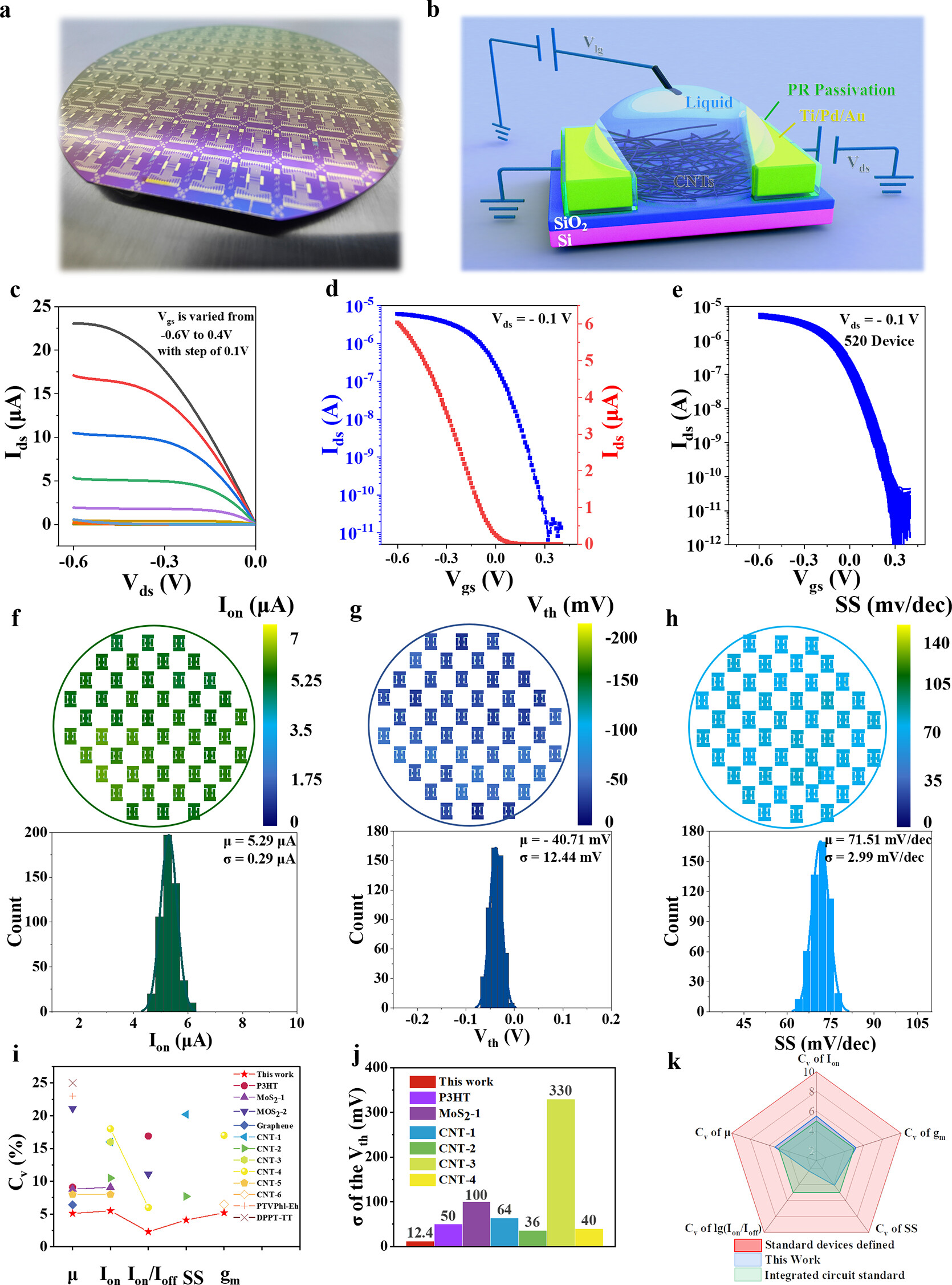图2:标准光刻工艺制备的CNT FET的电学特性