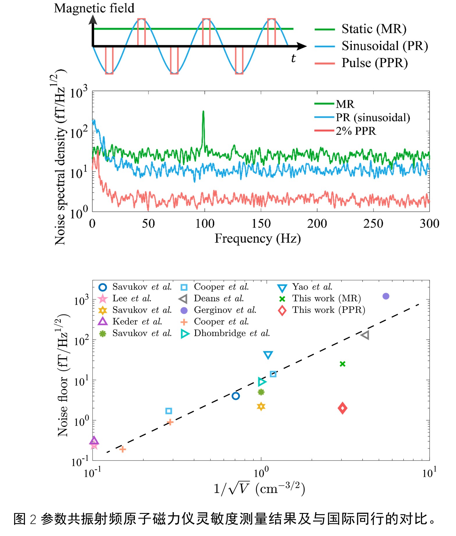 郭弘教授团队提出了一种基于参数共振的新型射频原子磁传感器。该方案通过利用脉冲磁场对原子自旋进行调制产生参数共振现象,能够实现高灵敏度的射频磁场测量(如图1所示)。与传统的磁共振方案相比,参数共振方案无需施加额外的偏置磁场以产生与待测射频场共振的拉莫进动频率信号,从而避免了磁共振方案中由偏置磁场引起的自旋交换碰撞弛豫问题,解决了射频原子磁传感器中信号线宽展宽的问题。在相同的实验装置下,参数共振方案实现了一个数量级以上的磁传感器灵敏度的提升,在小型铷87原子中实现了噪声水平低至2 fT/Hz1/2的高灵敏度射频原子磁传感器(如图2所示)。这一研究成果为射频原子磁传感器的高灵敏度测量提供了新的技术途径,为磁场探测技术在工业检测、医疗成像和国防安全等领域提供了更为广阔的应用前景。
