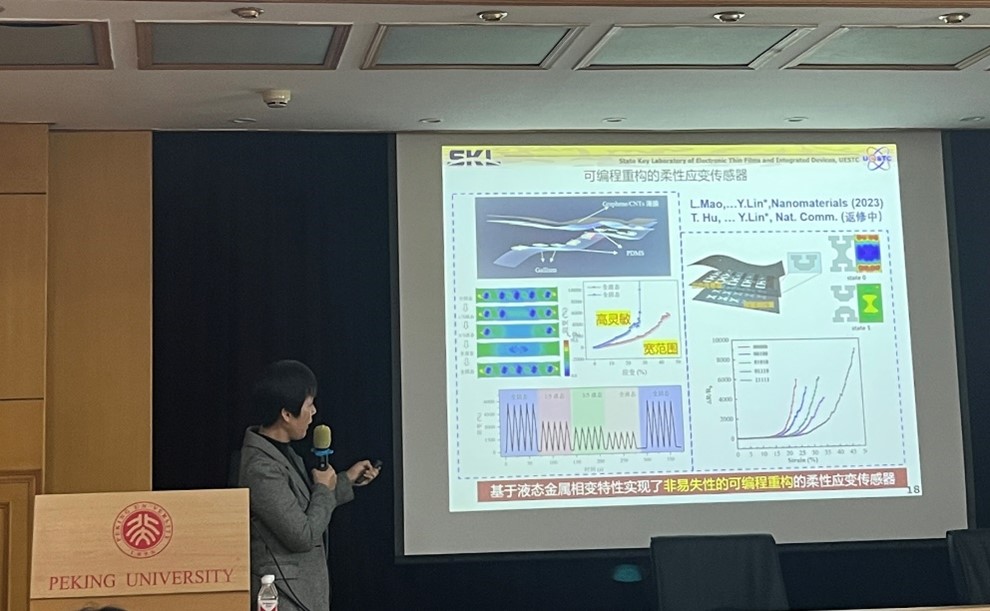 然后,林教授介绍了在柔性可穿戴传感器领域面临的挑战。针对高灵敏度与可延展性之间的平衡问题,林教授介绍了课题组提出的基于液态金属相变特性非易失性的可编程重构的柔性应变传感器。针对三维可延展性问题,林媛教授课题组结合蛇形和螺旋结构构筑了三维延展性均可达200%的柔性电子器件。针对小型化多功能集成问题,林媛教授课题组通过多层集成方法,构筑了系列多传感功能集成器件。