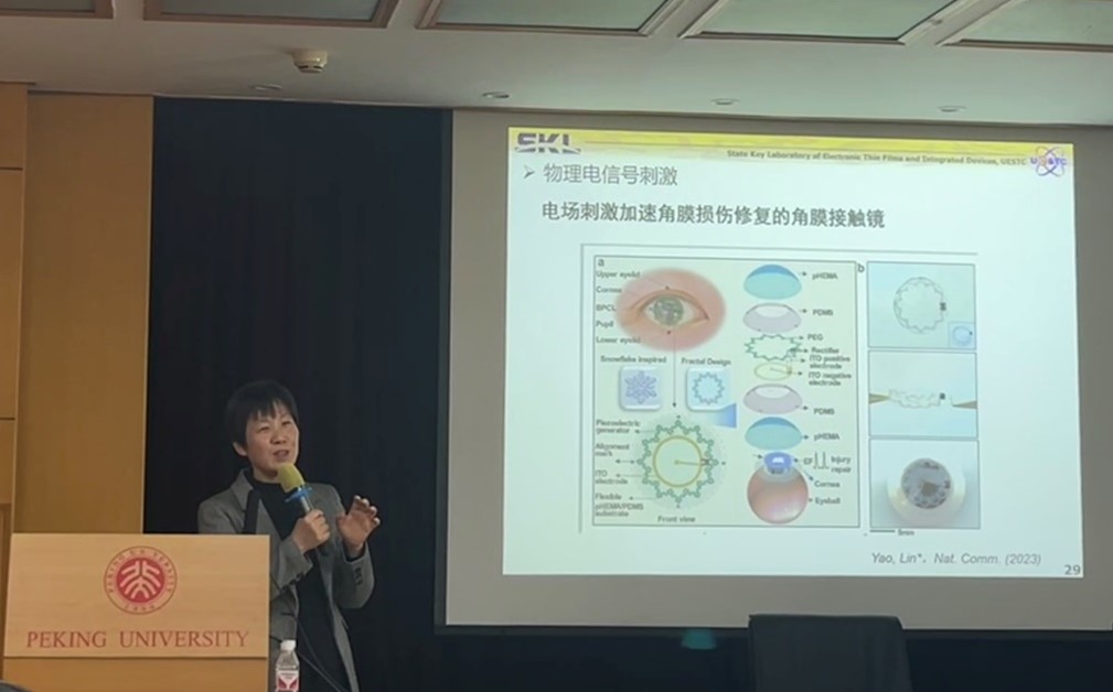 随后,林教授介绍了课题组在柔性可穿戴刺激器件方向上的工作。林媛教授课题组构筑了能够产生电场刺激的柔性电子系统用于角膜损伤修复。为了促进伤口愈合,林媛教授课题组研究出温度可激活、可编程的力电协同器件。