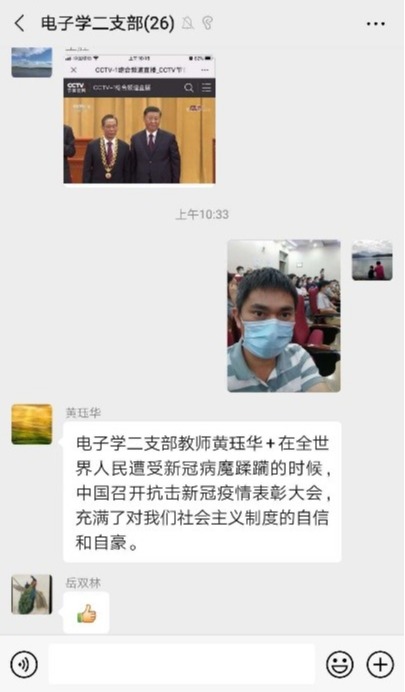 9月8日上午,全国抗击新冠肺炎疫情表彰大会在北京人民大会堂隆重举行。在学院党委的统一部署下,电子学系教工第二支部组织支部党员观看了这次大会。支部根据每位党员的便利情况,采用集中统一观看和自行观看两种方式。除了3位党员因出差或者有会议安排表示之后回看表彰大会外,支部其他党员都采取以上两种方式观看表彰大会的直播。大会观看过程中,支部党员积极参与讨论交流,纷纷在支部微信群分享自己的观看情况和观看心得。