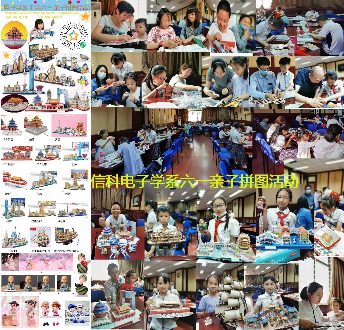 一年一度的“六一”儿童节又到了,电子学系工会为会员们组织了亲子拼图活动。系工会精心选择了十余款各有特色的立体拼图,有传统的天坛、天安门、角楼等个体中式建筑,也有世界各地著名城市的标志性建筑集合,如上海拼图涵盖了东方明珠、上海环球金融中心、世博会中国馆、上海海关大楼、上海汇丰银行大厦等标志性建筑,威尼斯拼图里有叹息桥、黄金宫殿、圣马可大教堂等,还有巴黎、巴塞罗那、慕尼黑、伦敦、武汉、纽约等知名城市的建筑集合拼图;除了建筑拼图,也有精致气派的蒸汽船、大帆船等。