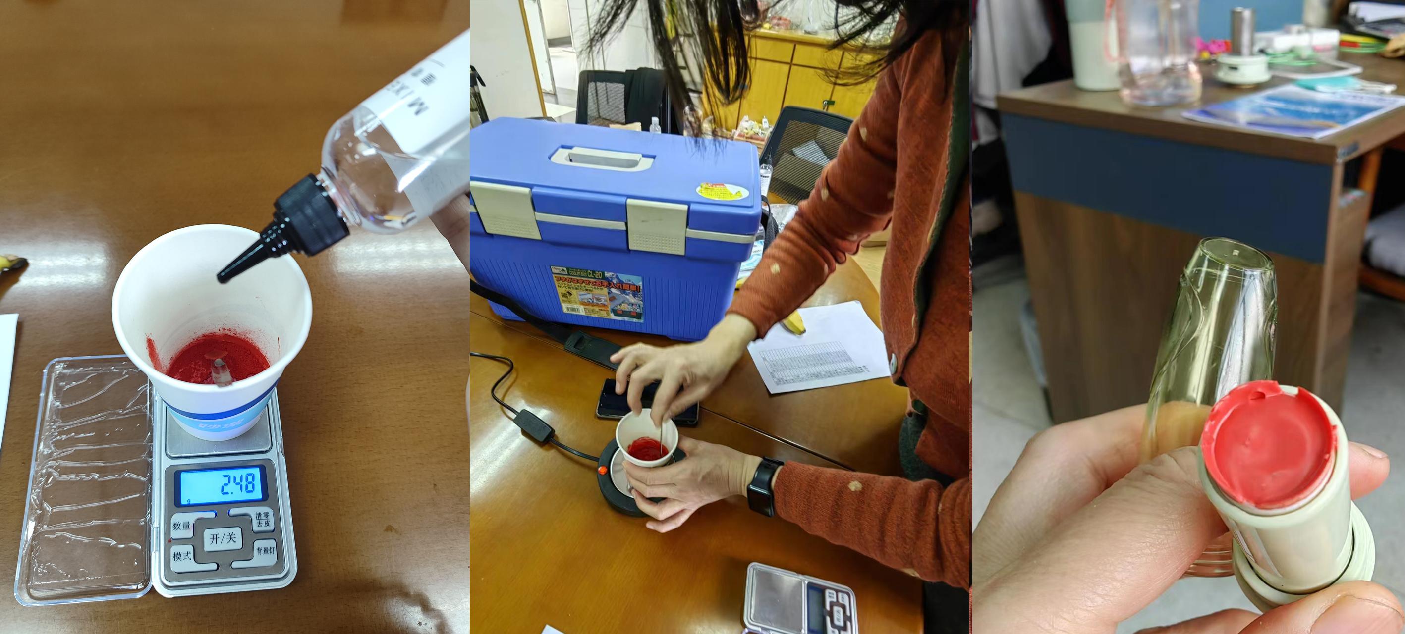 图2称量、加热搅拌、成品口红