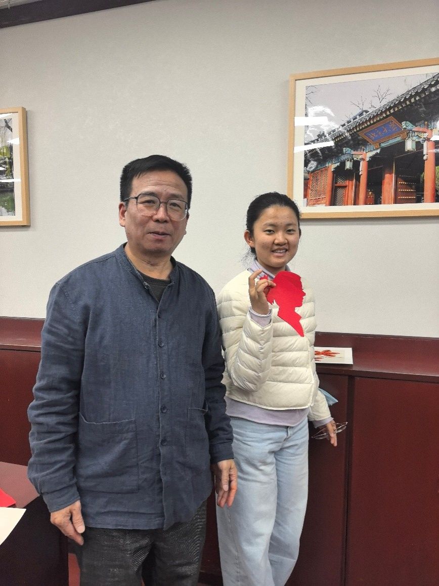 活动现场,胡才春老师还即兴展示了他多才多艺的一面。他应邀为曹老师创作侧面剪影,仅凭一把剪刀,在红纸上娴熟运剪,寥寥数秒间,人物的发型、轮廓与神韵便跃然纸上,一幅惟妙惟肖的剪影作品瞬间完成,赢得了在场老师的齐声赞叹,将现场气氛推向了一个小高潮。