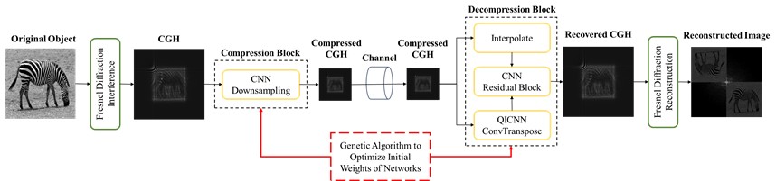 图1 基于遗传算法优化量子启发式卷积神经网络压缩传输计算全息图的方案图