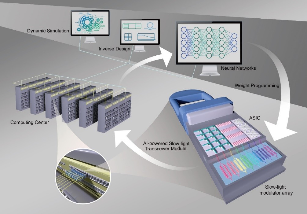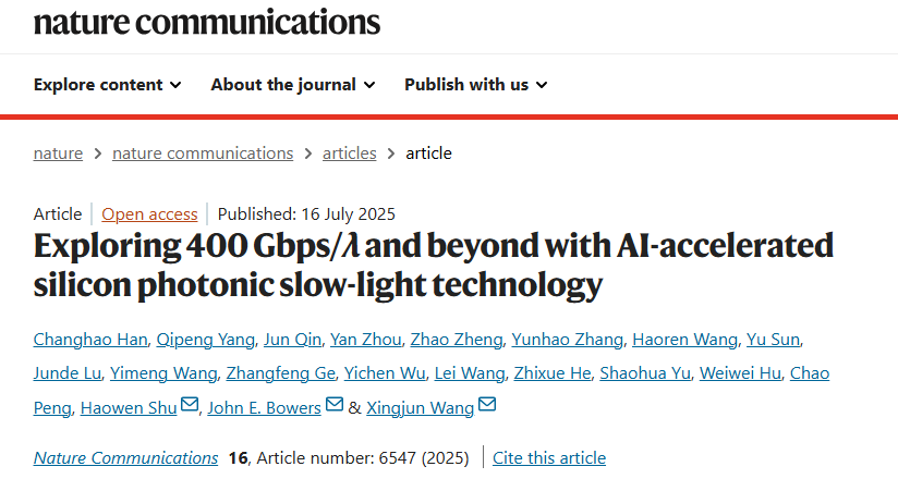 王兴军教授、舒浩文研究员和美国加州大学圣塔芭芭拉分校John E. Bowers院士联合团队在超高速光互连领域取得突破性进展,在标准硅基光电子平台上首次实现了单波400 Gbps的超高速多通道信号传输实验。所提出的人工智能加速硅慢光调制技术以高带宽纯硅慢光调制器芯片为基础,针对硅慢光平台非线性失真所设计的人工智能均衡器为驱动,实现了标准硅光平台单波传输速率的大幅提高,是国际上首次实现硅基单波400 Gbps的成果,对于下一代算力中心的发展具有重要意义。7月16日,相关研究成果以《利用人工智能加速硅慢光技术探索单波400 Gbps及更高速率传输》(“Exploring 400 Gbps/λand beyond with AI-accelerated silicon photonic slow-light technology”)为题,在线发表于Nature子刊《自然·通讯》(Nature Communications)。