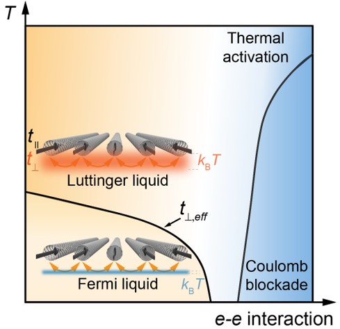 图1 耦合一维阵列的电子关联相图,电子-电子相互作用与温度调控下的三个量子态:Fermi liquid、Luttinger liquid和Coulomb blockade。
