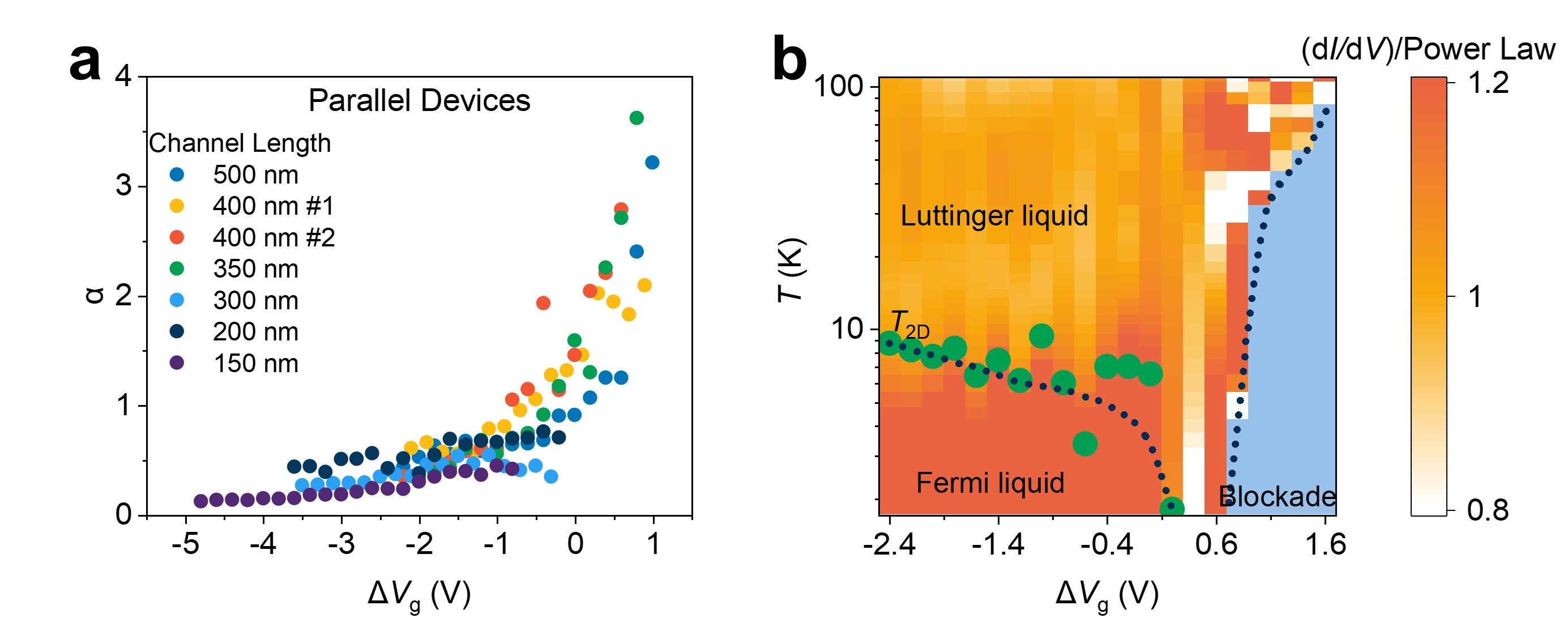 进一步的研究表明,通过调节栅极电压,多个器件中均观察到一致的Luttinger liquid幂律指数规律:随载流子浓度增加,电子-电子相互作用因管间介电屏蔽效应而减弱,清晰地验证了可调控的电子关联效应(图3a)。在高载流子浓度区间,随着温度的进一步降低,管间耦合效应开始影响电子特性,体系从Luttinger liquid行为过渡到Fermi liquid行为;而在低载流子浓度区间,电子局域化效应明显,体系表现为热激发的库伦阻塞特征(图3b)。通过对输运行为的系统分析,团队成功构建了耦合一维电子体系的完整实验相图,揭示了电子关联效应在维度调控下的系统性转变,为理解低维体系中的量子相行为提供了直接实验证据。