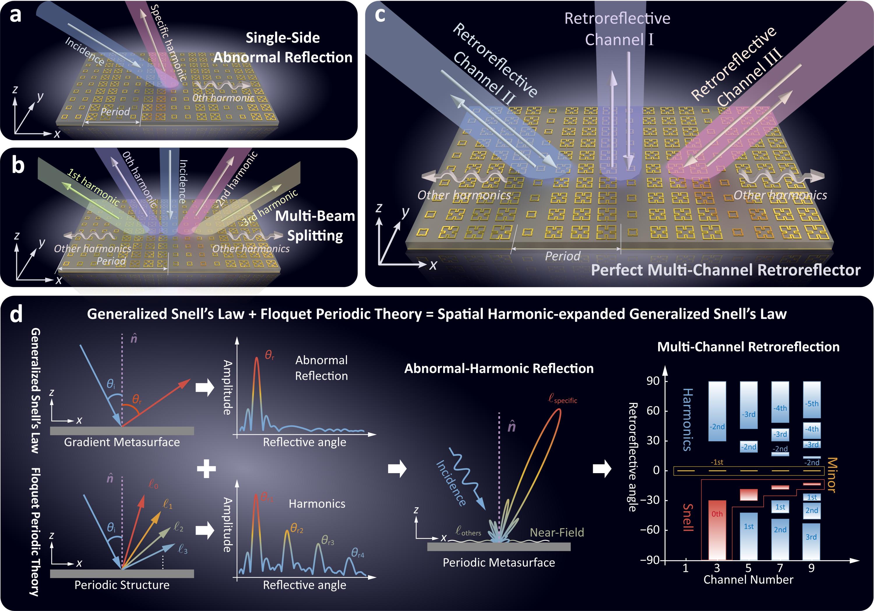 图1:a 空间谐波异常单边反射示意图;b 多波束分裂示意图;c 完美多通道回射示意图;d 基于SH-CSL操控空间谐波传播行为以及实现多通道回射示意图。