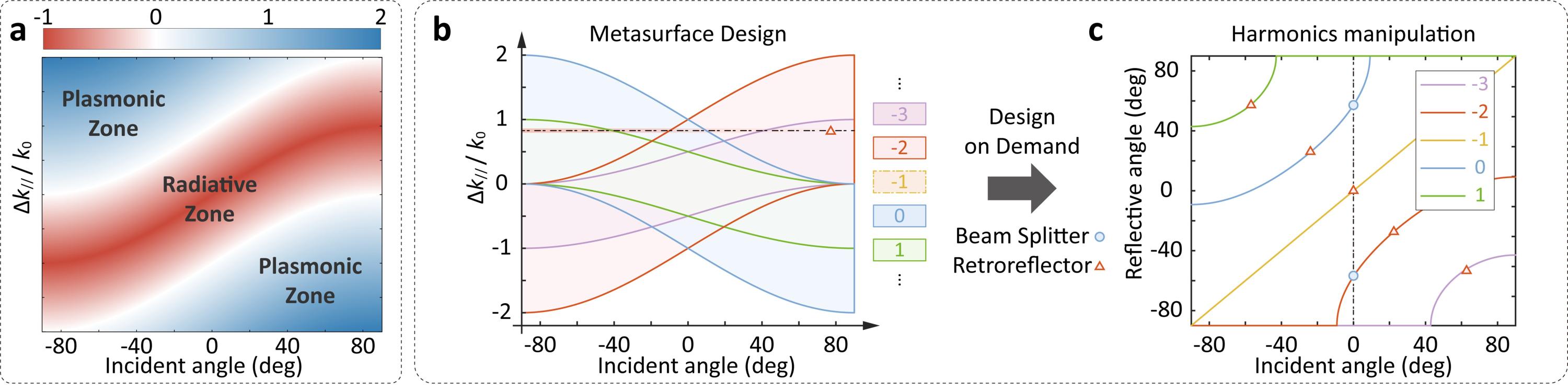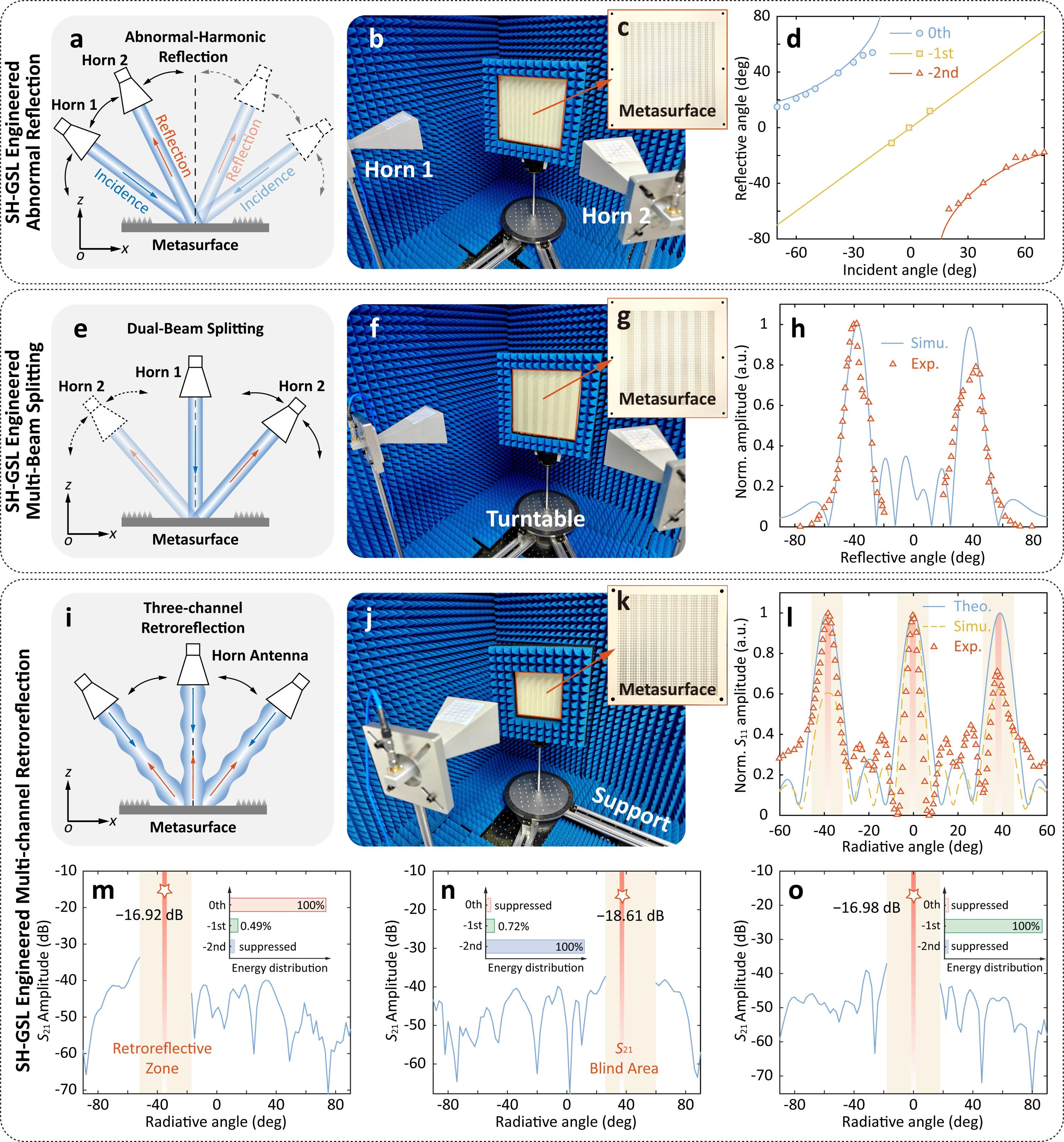团队基于SH-GSL验证了三类功能器件:空间谐波异常单边反射(图1a)——角度偏差小于5°的高精度谐波控制、基于空间谐波的多波束分裂(图1b)——突破传统单通道限制的双波束和四波束分裂、以及效率高达99%的“完美”三通道回射(图1c)。将广义斯涅耳定律与超表面的周期特性(弗洛奎周期定理)结合,各阶空间谐波的传播行为(远场辐射或近场局域)可通过确定性的动量补偿机制加以操控(图1d),进而可实现多通道回射(图1d)。