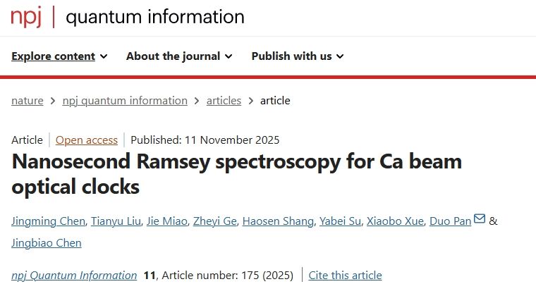 陈景标教授团队在钙束光钟关键技术领域取得重要进展。针对钙原子束光钟稳定度受限于量子投影噪声极限这一瓶颈问题,团队提出纳秒拉姆塞光谱(Nanosecond Ramsey Spectroscopy)技术,实现原子束中全部横向速度原子的高效利用,使系统的量子投影噪声极限频率稳定度达到媲美国际最好的冷原子光晶格钟水平。这一成果不仅为突破传统热原子束光钟原子利用率低的长期瓶颈提供了原创性解决方案,也为构建新一代高精度守时飞轮光钟奠定了核心技术基础。相关研究成果以 “Nanosecond Ramsey spectroscopy for Ca beam optical clocks”为题,发表在 Nature 旗下的国际期刊 npj Quantum Information 上。