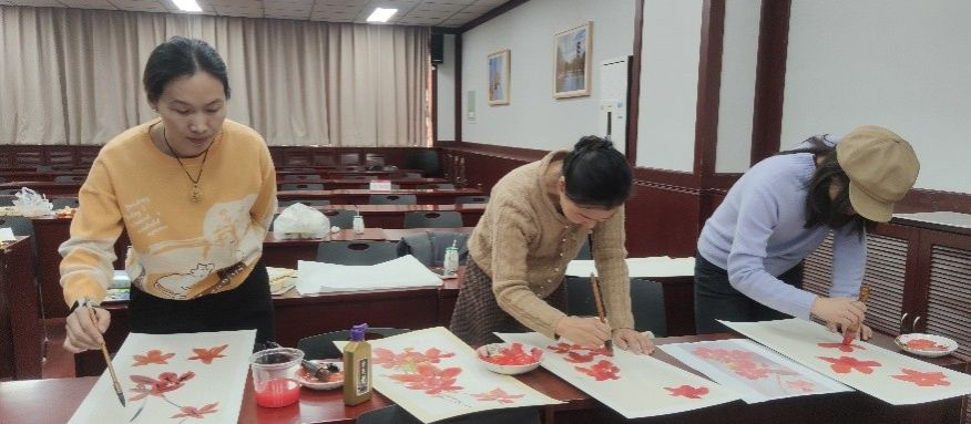 随后,活动进入了绘画实践环节。胡老师特别挑选了一幅枫叶照片作为创作蓝本,带领在场老师们亲身实践。他从如何执笔、如何蘸墨调色等基础讲起,耐心细致地手把手教导大家如何运用毛笔表现枫叶的形态与脉络,如何勾勒树枝的苍劲与灵动。在胡老师富有感染力的指导下,老师们的创作热情被充分调动,纷纷跃跃欲试,铺开宣纸,挥毫泼墨。一时间,活动现场墨香四溢,气氛热烈。尽管笔法尚显生涩,但每位老师都全心投入,最终在胡老师的点拨下,完成了一幅幅各具特色的枫叶写意画作品。通过亲身体验,大家深刻体会到了艺术家如何在平凡生活中捕捉美的瞬间,并运用画笔将其永恒记录于方寸之间的创作过程。