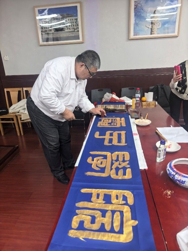 ”四个金灿灿的方篆大字,其作品古朴典雅,气韵非凡,赢得了在场教师的阵阵掌声,也为本次艺术讲座画上了圆满的句号。