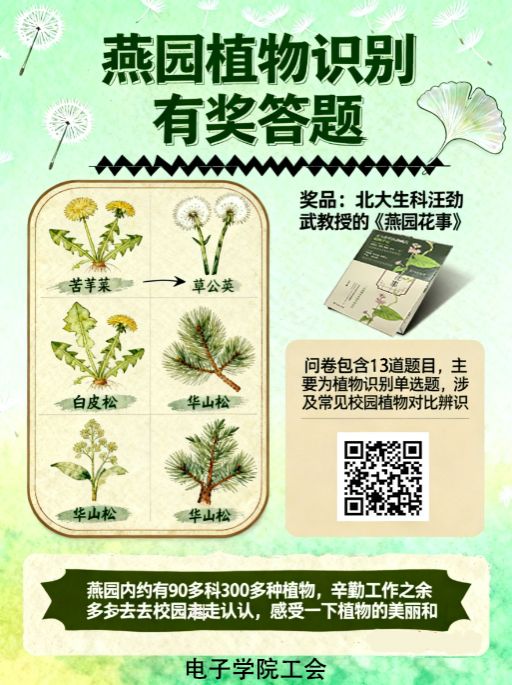 成果趣味检验:为巩固学习成果,活动于11月特别推出了燕园植物识别有奖问卷,优胜者获得了北大植物分类专家汪劲武教授所著的《燕园花事》作为奖品,将活动推向了一个小小的高潮。