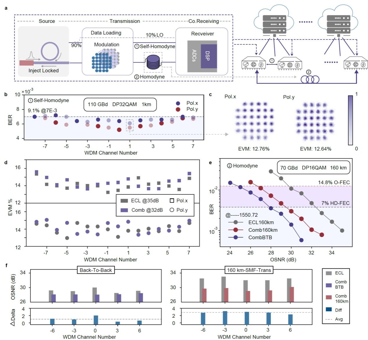 本研究主要验证了微腔光梳在标准通信场景下的性能。实验利用自注入锁定(SIL)微光梳中间功率最高的16根梳齿作为载波,分别进行了两种传输测试。首先是在1公里短距离的“自零差”系统中,单通道实现了110 Gbaud DP-32QAM的超高速率,单波长净速率突破1 Tbps 。其次是更接近实际城域网应用的160公里长距离“零差”传输,采用70 Gbaud DP-16QAM调制,实现了约8.96 Tbps的总容量。对比实验结果表明,相比于线宽约10 kHz的高性能商用外腔激光器(ECL),该微光梳由于具有极窄的线宽(<600 Hz),在长距离传输后表现出更低的误码率和更小的光信噪比(OSNR)代价,证明了其在对抗光纤非线性效应和相位噪声方面的优势 。
