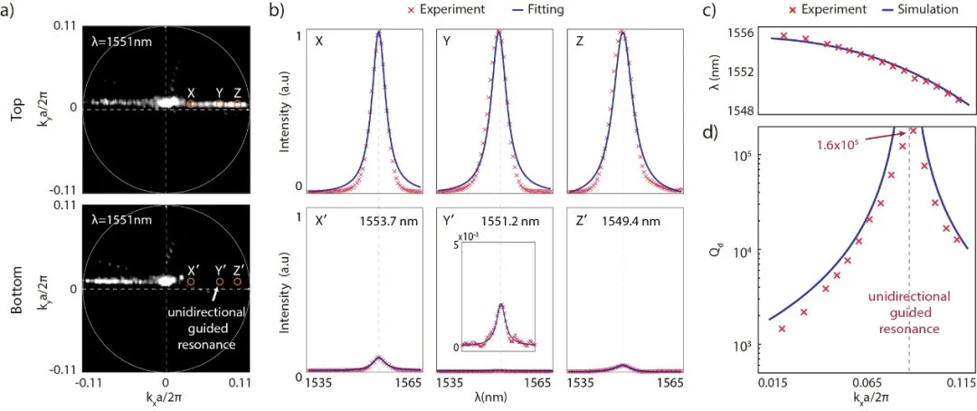 a,动量空间中上下表面远场辐射的傅里叶散射图像。b,傅里叶图像上不同kx点处随波长变化的散射谱。c,d,随kx变化的能带以及下表面单面品质因子。在UGR态附近,下表面单面品质因子高达1.6e5。