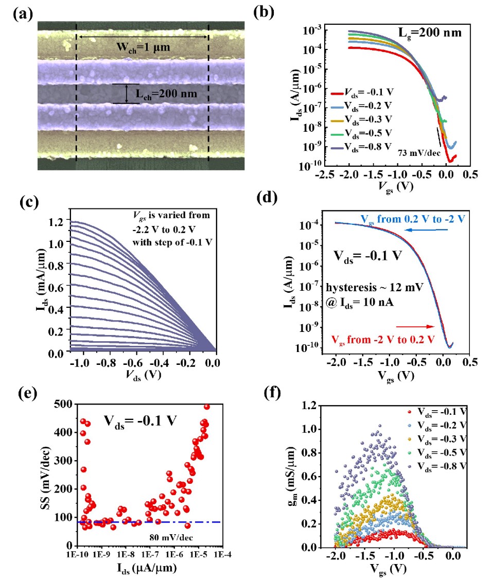 A片 电子学系碳基电子学研究中心、纳米器件物理与化学教育部重点实验室张志勇-彭练矛联合课题组一直从事高性能碳纳米管晶体管和集成电路制备的研究。从材料开始突破,前期发展了全新的提纯和自组装方法,制备出高密度、高纯半导体阵列碳纳米管材料,在4英寸基底上制备出密度为120 /μm、半导体纯度高达99.99995%的碳管阵列(Science 368, 850-856, 2020),从而达到超大规模碳管集成电路的需求,突破了长期以来阻碍碳管电子学发展的瓶颈,首次在实验上显示出碳管器件和集成电路较传统技术的性能优势,为推进碳基集成电路的实用化发展奠定了基础。并且在此基础上,首次实现了有望在太赫兹频段工作的碳纳米管射频晶体管和高性能放大器,充分展现了碳管在射频电子学上的优势和潜力(Nature Electronics 4, 405-410, 2021)。虽然目前碳纳米管阵列材料已经制备出高性能的晶体管和电路,但是由于在材料、器件结构以及工艺过程等方面缺少系统的优化,制备的空穴型场效应晶体管(p-FET)通常为耗尽型(即阈值电压为正值,在零栅压时仍有足够大的导电能力),亚阈值斜率摆幅(SS)远大于100 mV/dec,这些问题会给构建碳基集成电路带来较大困难,并大幅度增加电路的功耗。因此,基于高密度半导体碳纳米管阵列构建高性能增强型晶体管,成为发展碳基电子学所必须的关键技术。