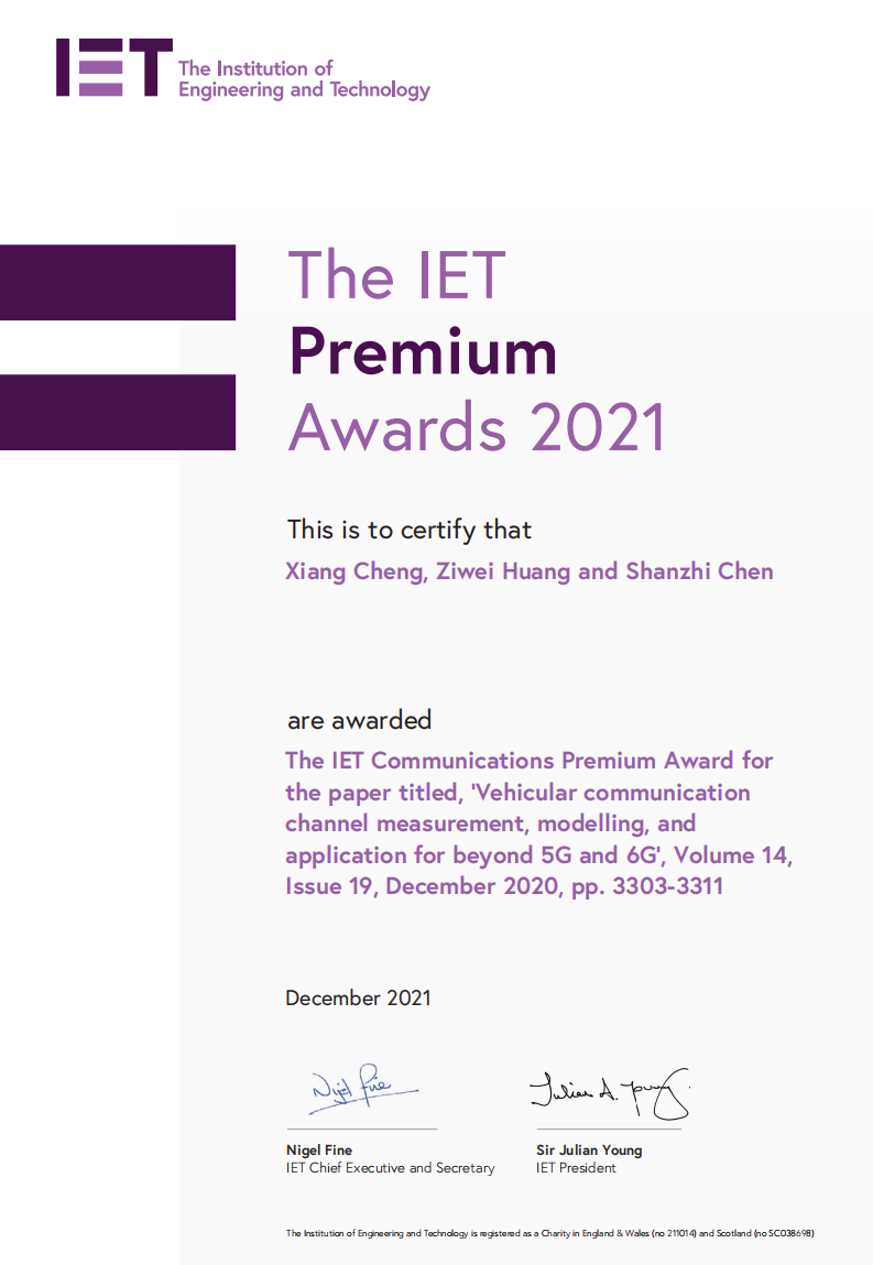 程翔教授团队发表在国际期刊IET Communications的论文“Vehicular Communication Channel Measurement, Modelling, and Application for Beyond 5G and 6G”荣获该期刊2021年度唯一最佳论文奖:Premium Award。该论文由A片