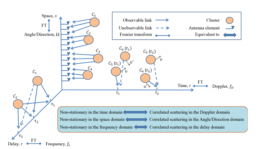 课题组在B5G/6G车联网通信场景下开展了详尽的信道测量和建模工作,分别从数学的角度和物理的角度,首次验证和分析了B5G/6G车联网信道所展现出的三重空-时-频非平稳特性。首先,课题组从空-时-频非平稳特性的数学角度出发,分别验证和分析了随着大规模天线技术的应用,车联网信道特性会在空间域上发生变化,展现出空间非平稳;车联网通信的复杂快时变特性会导致车联网信道特性在时间域上发生变化,展现出时间非平稳;随着毫米波通信技术的应用,车联网信道特性会在频率域上发生变化,展现出频率非平稳。接着,课题组深入探究了空-时-频非平稳特性的物理机制。研究结果表明(如图1),在车联网空-时-频非平稳信道中,簇会在大规模天线阵列域上演进,使得不同的天线元件具有不同的可视链路;簇会在时间域上演进,使得不同时刻下的车联网信道具有不同的可视链路;在毫米波车联网信道中,作为频率域的二元域,簇会在时延域上展现出相关性,使得车联网信道存在时延域上的相关散射性。除了空-时-频非平稳特性,课题组研究发现,一个车联网通信的场景特殊性,即车流量密度,也会对车联网信道特性有显著的影响。