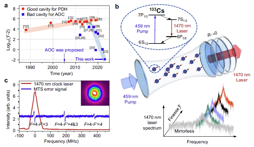 在这项研究中,激光器腔精度接近于最低极限值2。利用如此低精细的谐振腔实现激光,并研究其物理原理和机制,证明其在量子精度测量中的独特优势,之前从未被报道过。该工作利用7.17 MHz的增益线宽,实现了1.2 kHz的窄线宽激光输出,实现了优于原子跃迁自然线宽3个量级的线宽压窄效果。实验上得到腔牵引系数为0.0148,是目前连续波主动光钟激光器的最低值。极坏腔激光的新概念不同于传统激光,这一研究成果为实现主动光钟超窄线宽激光提供了新的技术途径,有望开启量子物理的一个全新研究领域。