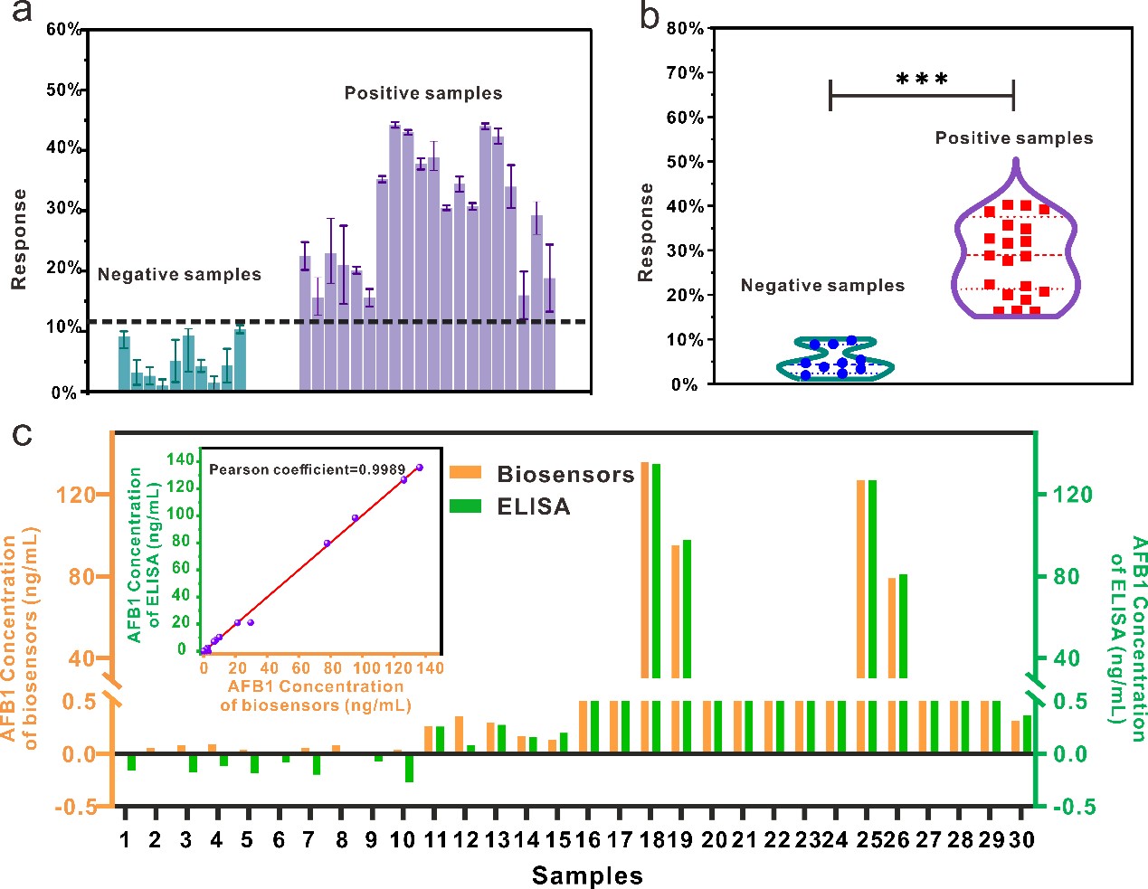 此外,该研究考察了传感器对玉米样本中AFB1检测的特异性和重复性。AFB1与干扰物脱氧雪腐镰刀菌烯醇(DON)和玉米赤霉烯酮(ZEN)的交叉反应系数分别为1.8×10-7和1.2×10-6。重复性分析中标准差为0.02,容差低于0.1。