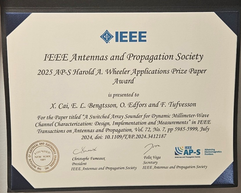 蔡雪松预聘副教授作为第一作者兼通讯作者在天线与传播领域顶级期刊IEEE Transactions on Antennas and Propagation(IEEE TAP,中科院1区)发表的论文“A Switched Array Sounder for Dynamic Millimeter-Wave Channel Characterization: Design, Implementation, and Measurements”荣获2025年度IEEE天线与传播学会哈罗德・A・惠勒应用论文奖(Harold A. Wheeler Applications Prize Paper Award)。其合作者包括瑞典索尼欧洲研究中心研究员Erik L. Bengtsson,瑞典隆德大学电气与信息技术系教授Ove Edfors,瑞典隆德大学电气与信息技术系教授Fredrik Tufvesson。