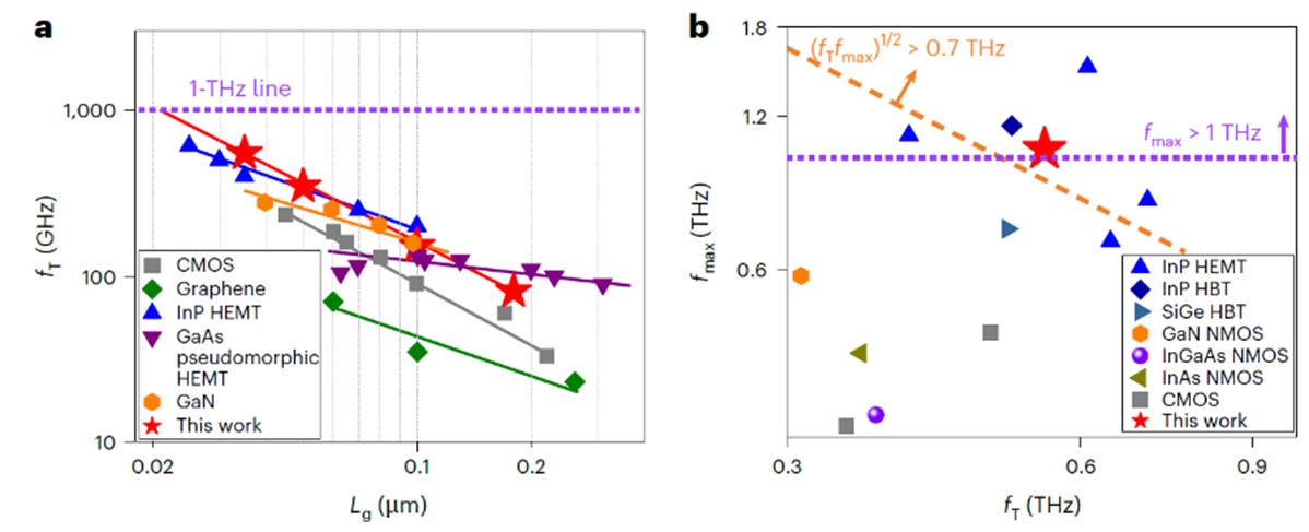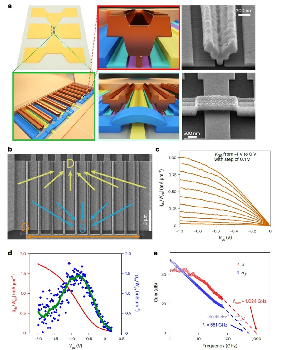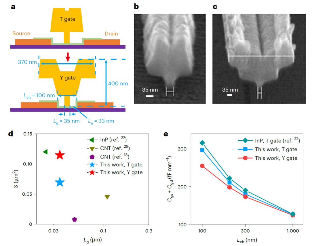 、碳基电子学研究中心、纳米器件物理与化学教育部重点实验室张志勇-彭练矛联合课题组基于阵列碳纳米管,通过缩减栅长至35nm并引入先进的Y型栅电极结构,降低栅电阻的同时保持低的寄生电容特性,成功制备出首个截止频率fmax超过1THz的金属氧化物半导体场效应晶体管,充分展现出碳纳米管在太赫兹高速领域的巨大应用价值。