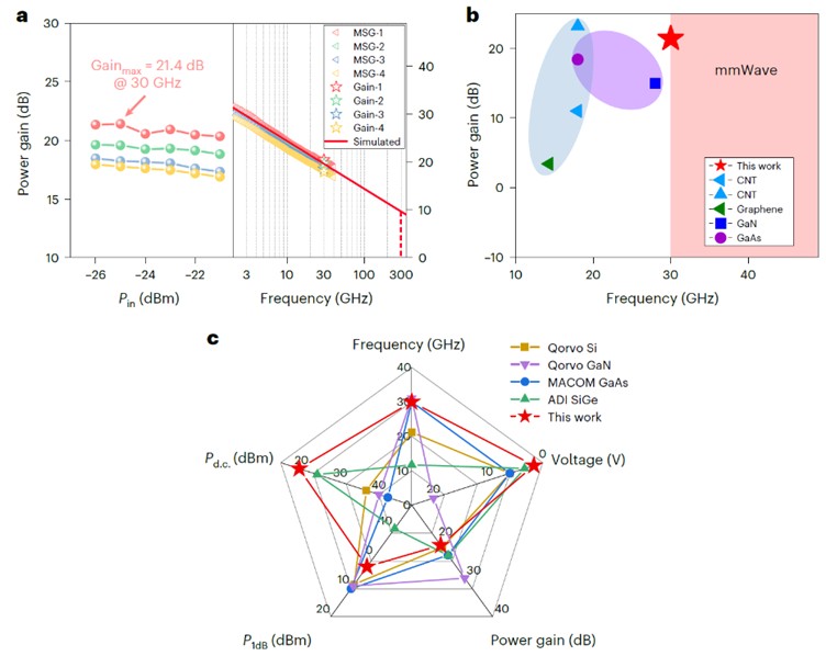 凭借优化的Y型栅电极结构,相较于传统T型栅电极,具有更大截面积(更低栅电阻)和更低寄生电容的优异特性,因此在尺寸缩减过程中,具有超过其他所有材料的高频性能,同时也是除三五族材料(InP/InGaAs)外,唯一一个实现截止频率达到1THz的半导体材料。基于改进的阵列碳纳米管射频器件,进一步制备出的毫米波放大器实现了30GHz下21.4dB的增益,具有与GaN、GaAs等材料商用器件相媲美的放大性能。
