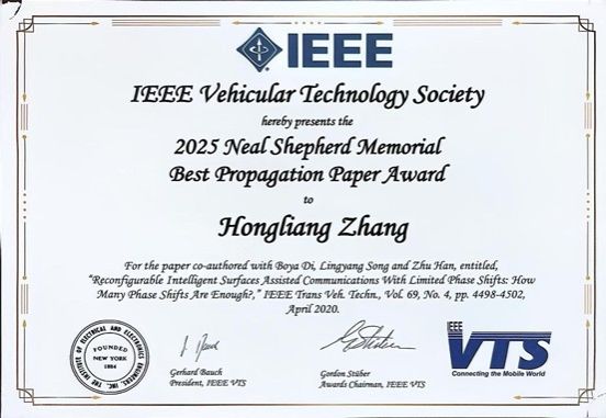 张泓亮助理教授、邸博雅助理教授、宋令阳教授获颁2025年IEEE尼尔谢菲尔德最佳传播论文奖(IEEE Neal Shepherd Memorial Best Propagation Paper Award)。该奖项由IEEE车载技术学会(VTS)于1993年设立,评选出过去5年内在国际无线通信领域权威期刊IEEE Transactions on Vehicular Technology上发表的最佳传播论文,每年仅表彰1篇。