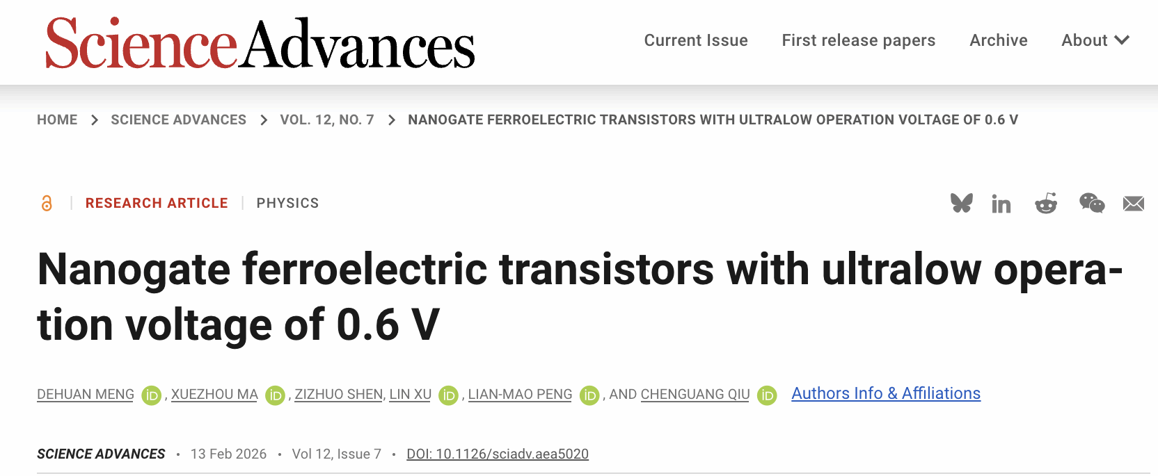 邱晨光-彭练矛团队首次提出“纳米栅超低功耗铁电晶体管”。团队通过精巧设计铁电存储的器件结构,引入纳米栅极电场汇聚增强效应,研制出可在0.6V超低电压下工作的铁电晶体管,能耗降低至0.45 fJ/μm,并且将物理栅长缩减到1纳米极限,为国际上迄今尺寸最小、功耗最低的铁电晶体管,为构建高性能亚1纳米节点芯片和高算力AI芯片架构提供了更具潜力的新物理机制存储器件。该突破性成果以“Nanogate ferroelectric transistors with ultralow operation voltage of 0.6 V ”为题,在线发表于Science子刊《科学·进展》(Science Advances)。
