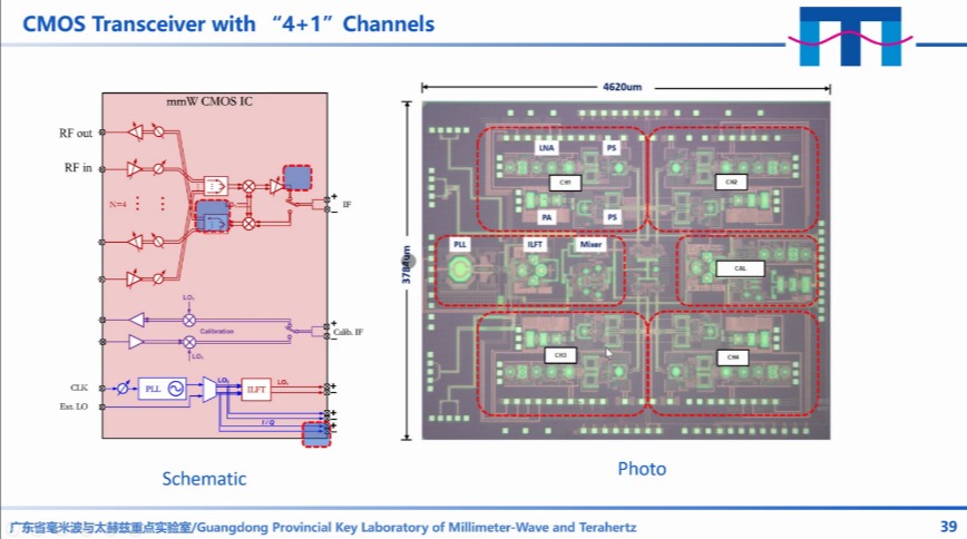 接下来,薛泉教授分别从毫米波CMOS集成电路、毫米波GaN集成电路、毫米波天线、系统集成四个方面介绍了最新的研究成果。针对CMOS集成电路,薛泉教授首先回顾了最新几年发表在JSSC期刊上的低噪声放大器,提出了一种新的宽带低噪声放大器的设计方法,通过三级的传输级联,获得平坦的宽带传输曲线。加工方面,使用65nm的工艺获得了同工艺下最小的噪声系数。接着,薛教授介绍了几种传统的移相器设计方法:级联式移相器、反射式移相器、矢量合成的移相器,提出了一种新的矢量合成式移相器:通过非正交的六个矢量合成,使得相位的误差更小,可以实现更精细的调节。实际制作的移相器只有450um×350um尺寸,与已有的成果比起来,具有先进性。然后介绍了无变容管的VCO设计,制作了28GHz和77GHz频率的振荡器,都达到国际先进水平。最后将几类元件集成为一个“4+1”通道CMOS收发机。
