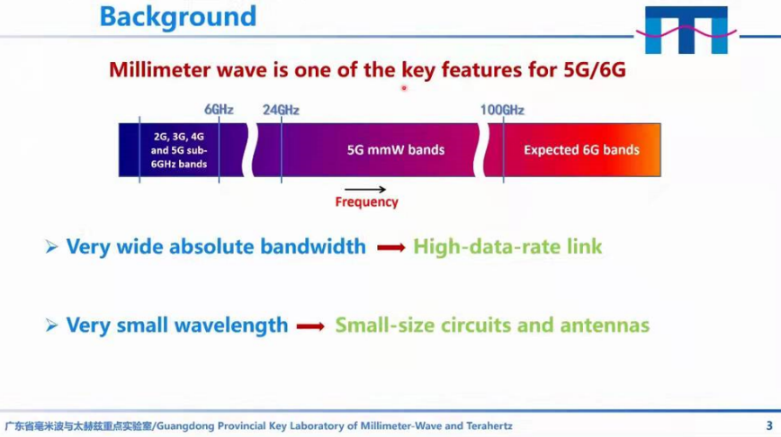 讲座伊始,薛泉教授介绍了毫米波通信的研究背景。毫米波作为5G和6G通信的关键技术,具有宽带宽和短波长的特点,这使得高速率的信息传输和小尺寸的电路和天线成为可能。对于天线阵来说,主要面临扫描角度小、互耦合强、损耗大,效率低、带宽窄等问题,宽扫描角、高隔离度、高效率、紧凑元件、宽带宽等参数,一直是毫米波研究领域的追求。