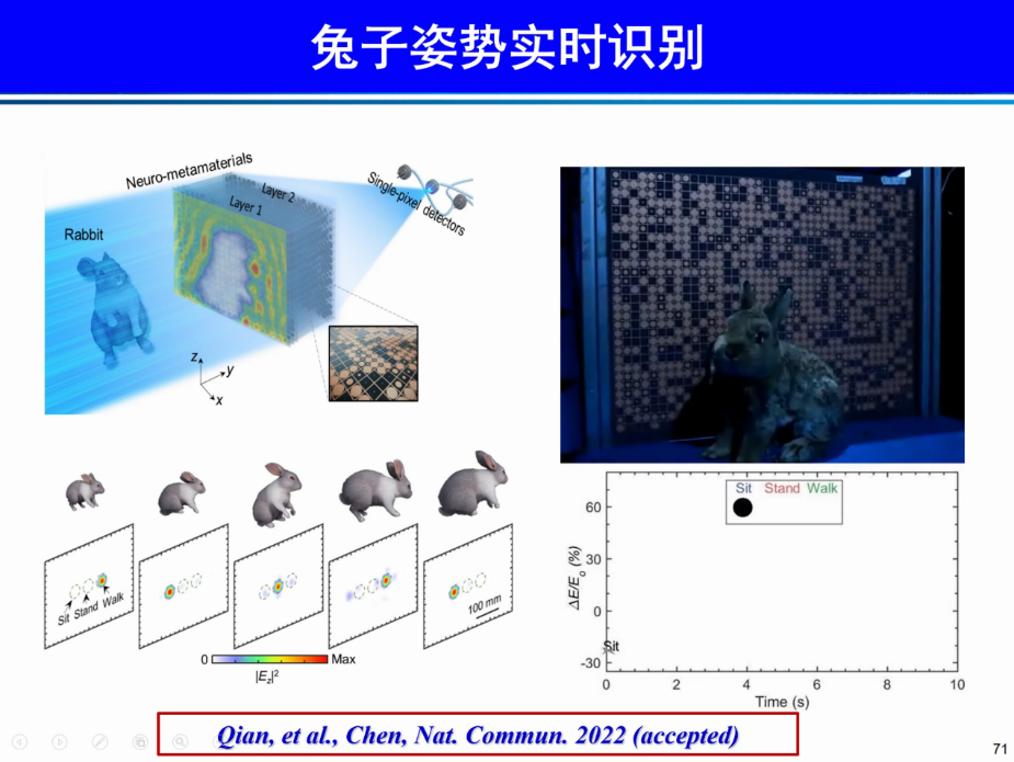 最后,陈红胜教授介绍了一种基于智能散射超材料的动态三维物体识别系统。智能超材料由非均匀超材料或传输超表面制成,并经过拓扑优化和深度学习等方法进行学习优化。同时,设计了兔子姿势实时识别实验,实现了光速级别的实时感知。通过智能化物体散射,使其按照用户自定义的方式传播,可实现光计算、智能感知或者幻觉的功能,在纳米光子芯片、计算机视觉和自动驾驶等领域有重要价值。