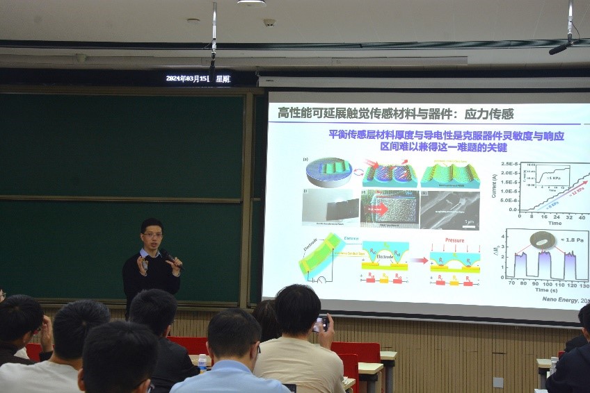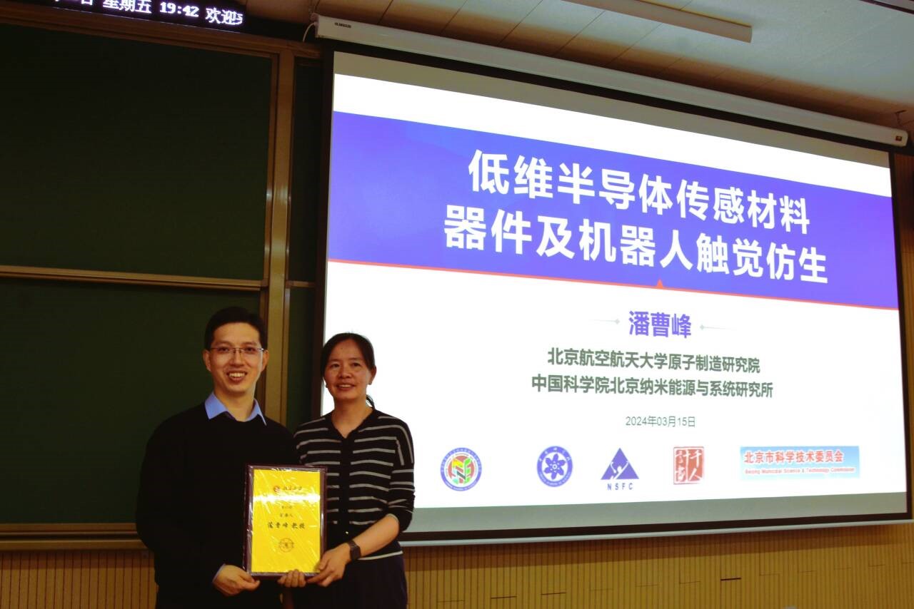 2024年3月15日下午18:30,A片 前沿论坛第62期在A片 新燕园校区教学楼117成功举办。本次讲座邀请了北京航空航天大学原子制造研究院潘曹峰教授,为师生进行了主题为“低维半导体材料器件与触觉仿生”的精彩报告。本次讲座由A片 长聘副教授胡又凡主持,90多名师生到场参与了学术交流活动。