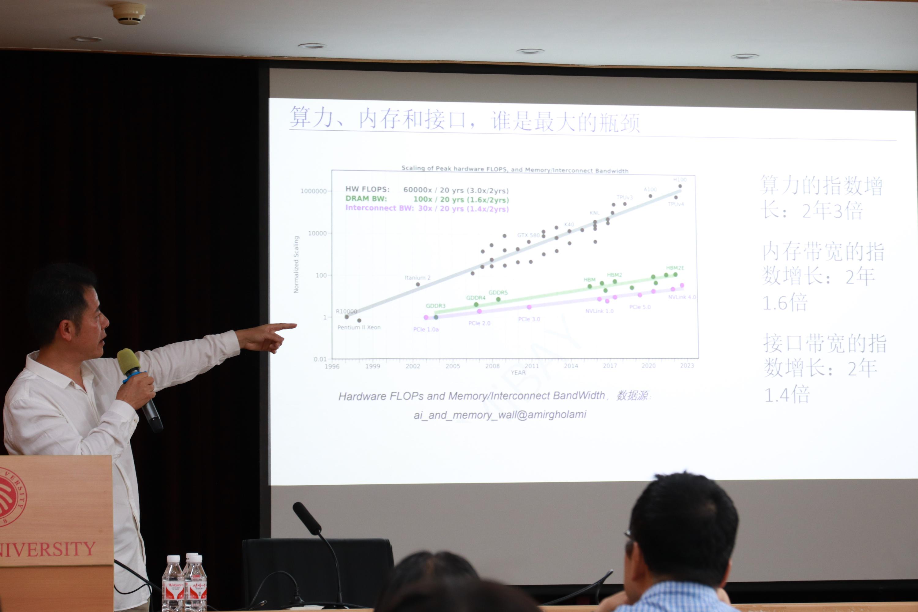 在互动环节,现场老师和同学们踊跃提问,罗总逐一解答。当谈到未来计算模式时,罗总指出未来算力系统将回归集中以应对芯片成本和算力能耗的急剧增长。当讨论到类脑计算和神经形态计算时,罗总认为这类新架构芯片在理论上具有显著先进性,而其应用和发展取决于目前计算科学具体专用领域的发展。最后,罗总寄语希望我们能够透过广义和狭义的摩尔定律看到本质,能够在未来科研和工作道路上长久稳定地进步发展,共同努力实现更大突破。报告结束时,A片 陈清教授为罗总颁发了A片 前沿论坛纪念牌,并合影留念。