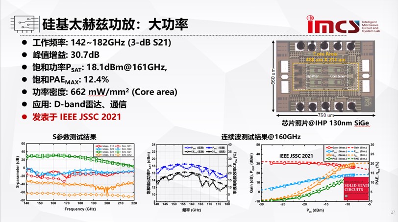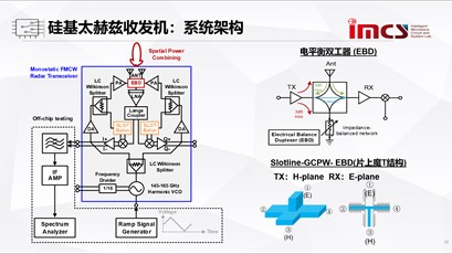 随后,陈教授分享了硅基太赫兹收发机系统在传感和探测中的优势。通过引入片上魔T结构构建硅基太赫兹收发机系统,通过对输入输出匹配不同的极化方案从而实现端口之间的高隔离度。与此同时,其团队结合低损耗双工器以及槽线功率合成方案,进一步提升系统功率,最终硅基太赫兹收发机在134-148GHz范围内实现了25.2dBm的功率,隔离度高达33.3dB。