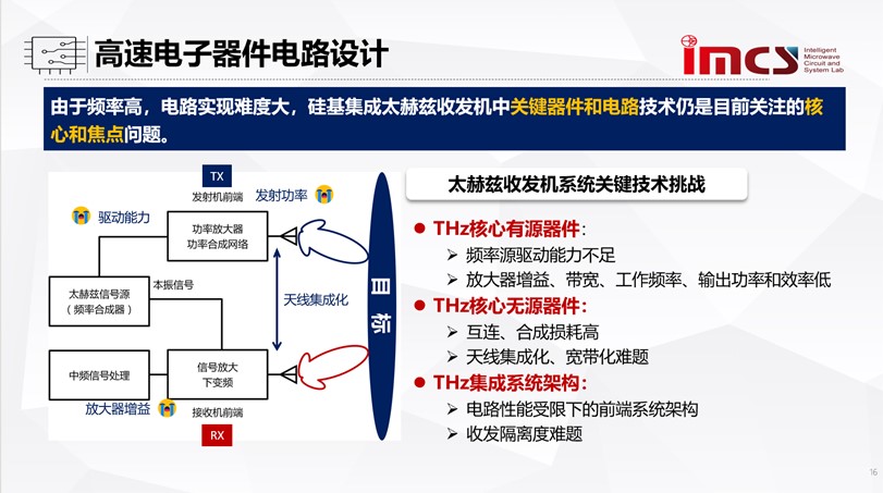 针对太赫兹高速电子器件的设计,陈教授提到工作频率高,电路实现难度大。在硅基集成太赫兹收发机系统中,继续推进有源、无源以及集成系统架构向更高频率发展面临重大挑战。为克服硅基工艺的限制,需要提出新型正反馈结构实现高增益和高稳定性。在太赫兹高频段,急剧增加的电路损耗需要开发全新的无源电路和网络结构,而在硅基太赫兹收发系统中提出前端混频/倍频架构以及片上集成天线均可以提升太赫兹集成电路的综合性能。