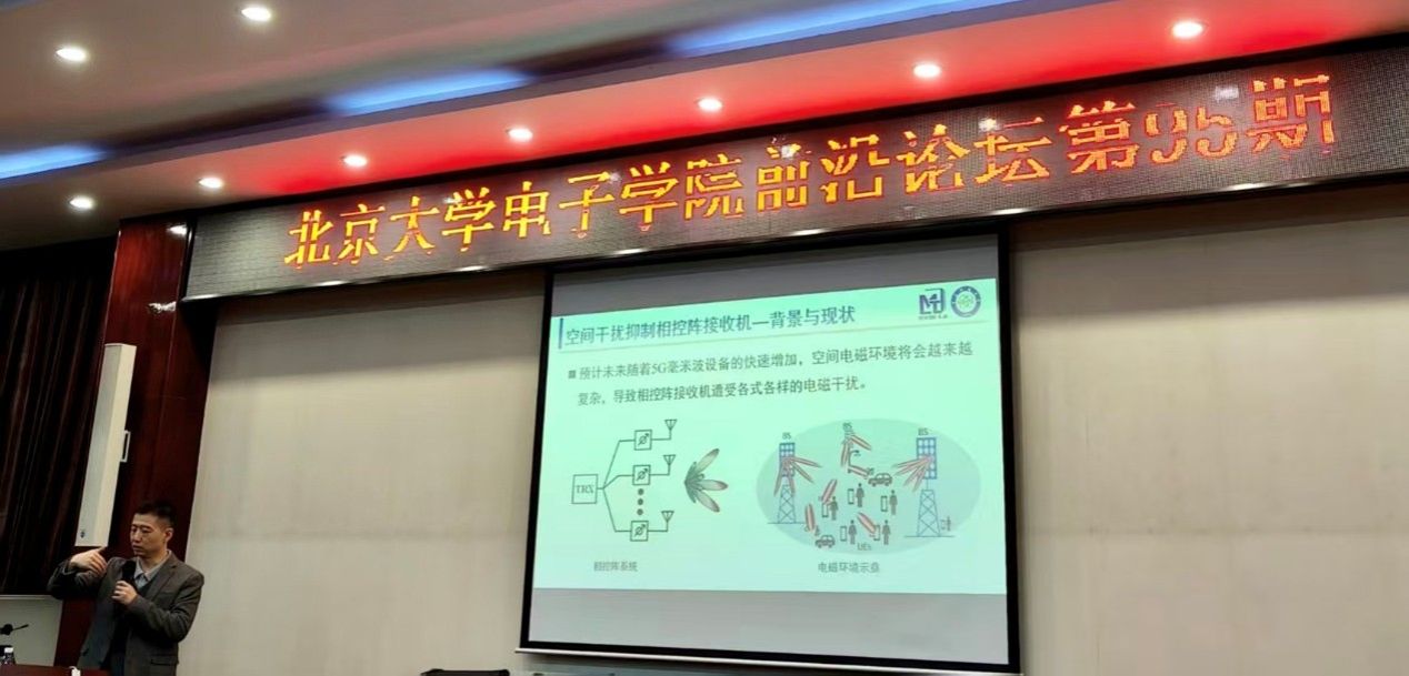 报告第一部分聚焦于“空间干扰抑制相控阵接收机”。康凯教授提出“波束零点调谐”的全新架构——在传统N通道射频链路旁并行嵌入M条干扰消除电路,通过幅度与相位反相合成,在干扰来向形成深度大于37 dB的辐射零点,且可同时对2个及以上干扰源实现宽角度抑制。同时展示了团队自主加工的多通道相控阵接收机,在强干扰环境下将接收信号EVM提升了3.3–6.9 dB,为复杂电磁环境下的高可靠通信提供了高效、低功耗解决方案。