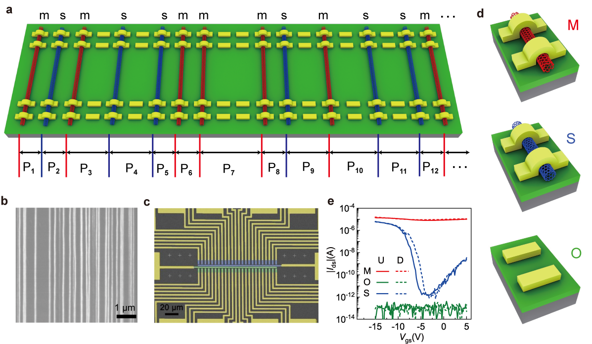 碳基电子学研究中心、纳米器件物理与化学教育部重点实验室、纳光电子前沿科学中心的张志勇-彭练矛联合课题组首次提出了孪生物理不可克隆功能(PUFs)的概念,在化学气相沉积法生长的碳管阵列上成功制备了孪生PUFs,并演示了其在加密通讯上的应用。碳管阵列在垂直于生长方向具有手性、位置随机性,而在平行方向具有一致性。在这种碳管阵列上制备的场效应晶体管具有三种不同的电学性质,即开路(0,无碳管)、半导体(S,纯半导体碳管S)和金属(M,至少一根金属碳管)。由于碳管的位置和手性是由随机成核和随机催化剂分布决定,所以晶体管将随机地显示O、S和M类型,其顺序既不可预测,也不可克隆。碳管在生长方向可以保持数百微米长度的性质不变,故在同一个碳管阵列上平行制造的两排晶体管阵列会显示出具有相同顺序的O、S和M类型,因此可以实现同时制备两个相同的孪生PUFs。对于一般的非孪生PUFs,在加密通讯前,需要把密钥存储在非易失性存储器,再分享给参与通讯的其他人,故降低了安全性,而孪生PUFs无需提前提取密钥,从而大大提高了安全性。