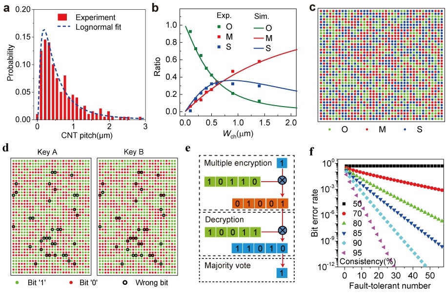 通过对碳管材料和器件尺寸的建模分析和优化,可以实现随机性最大化的三元PUFs,同时碳管的PUFs具有高特异性、高安全性、难以预测性和高稳定性。孪生PUFs的一致性约为95%,在通讯中会产生误码,作者通过容错设计,使用多个密钥加密一个明文,在解密后,再通过投票的方法确定发送的信息,这样可以将加密和解密过程的误码率降低到万亿分之一。